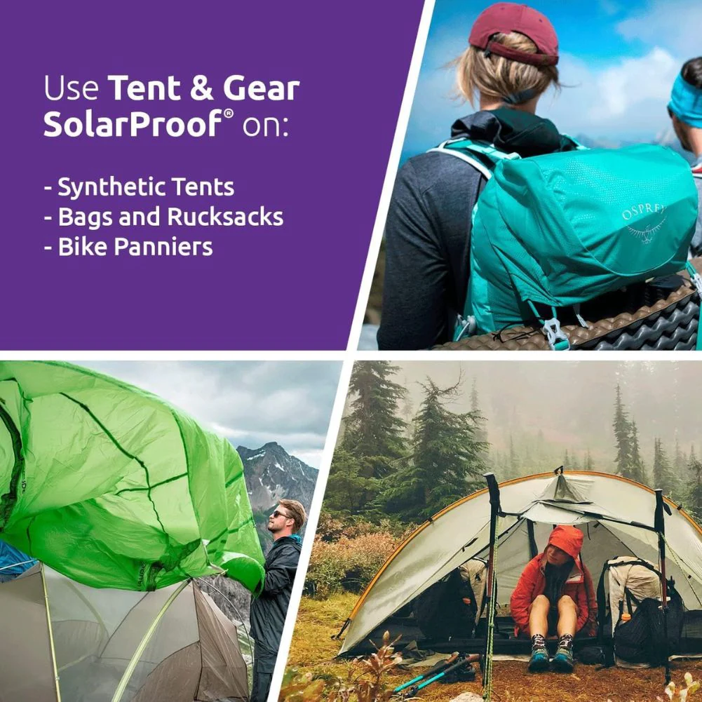 Nikwax Tent & Gear Solar Proof provides superior waterproofing and doubles the useful life of tents and awnings by protecting against UV damage.