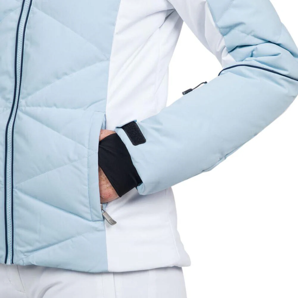 Zip up warmth you can feel. The Rossignol Women's Staci Ski Jacket (Glacier) offers all-conditions warmth with down-like synthetic insulation that seals in heat. A waterproof, breathable membrane seals out cold, stormy weather to keep you dry. A built-in powder skirt and integrated stretch cuffs with thumb loops further seal out the cold. The removable hood includes a detachable faux-fur trim for easy customization. Design details include a feminine fit and a signature rooster logo patch that reflects Rossignol's alpine legacy.